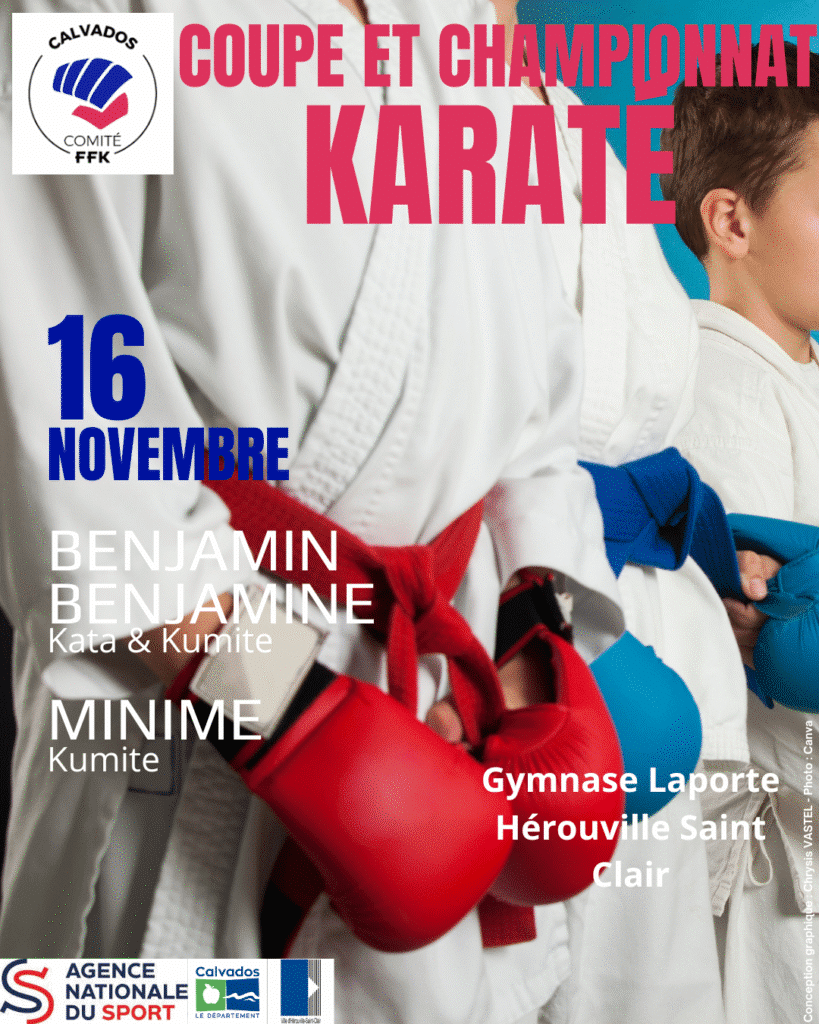 La coupe du Calvados Benjamin/es Kata/Kumite et le Championnat Minimes Kumite se tiendront le dimanche 16 novembre 2025 à Hérouville Saint Clair (gymnase Laporte)